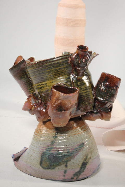 Exploration of joining elements, creating formal structures, capturing movement from the wheel to the reduction firing. Celebrated in glazing, that flows from top to bottom and from inside to out.
